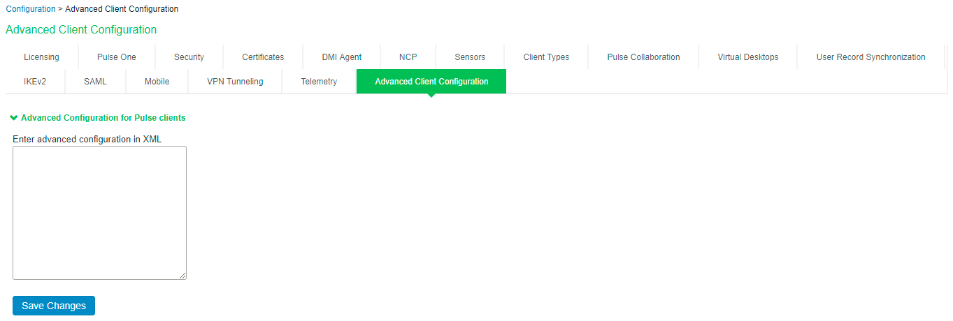 This topic describes the XML advanced Ivanti Secure Access Client configuration that can be used by the Ivanti Connect Secure administrator to configure the custom settings, which are meant to solve a specific customer scenario without changing the Ivanti Connect Secure admin console. Admin can set these custom settings in the form of XML input through the Advanced Client Configuration UI feature. Ivanti Secure Access Clients supporting these custom settings will consume them when connecting to this Ivanti Connect Secure, and the same would be applied on Ivanti Secure Access Client machines. This feature minimize the number of changes going into the Ivanti Connect Secure admin console to fulfill the requirement of a specific customer.