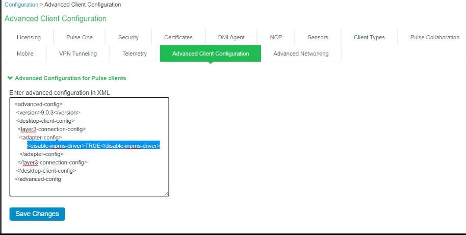 •On the ICS UI, navigate to System --> Configuration --> Advance Client Configuration. Under, Advanced Configuration for Ivanti Secure Access Client, set the <disable-jnprns-driver> flag to “True” as shown in the figure.